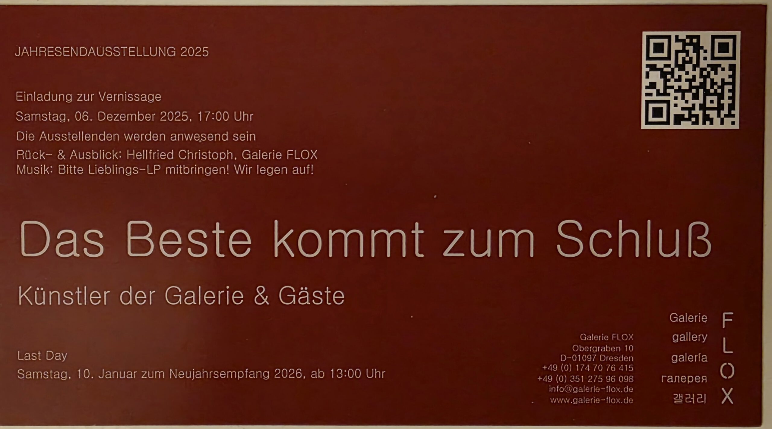 Herzliche Einladung zur Jahresausstellung der Galerie FLOX. Die Vernissage ist am 06. Dezember um 17.00 Uhr. Ich werde anwesend sein und stelle mit aus.